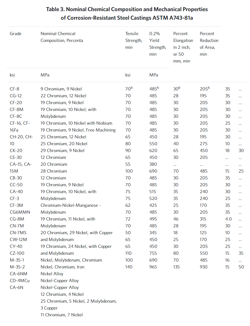 b For low ferrite or non-magnetic castings of this grade, the following values shall apply: tensile strength, min, 65 ksi (450 MPa); yield point, min, 28 ksi (195 MPa).