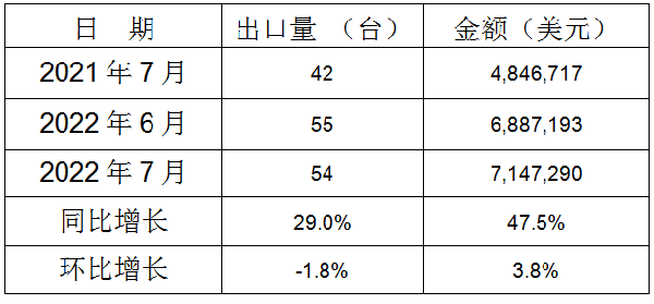 1-7月冷室压铸机共计出口279台,同比增长11.6%。其中:7月份出口54台,同比增长29.0%,环比增长-1.8%,见表9和表10。