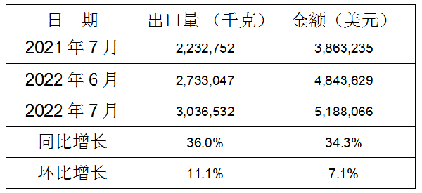1-7月铸模及铸芯用粘合剂共计出口1.7万吨,同比增长9.8%。其中:7月份出口0.3万吨,同比增长36.0%,环比增长11.1%,见表11和表12。