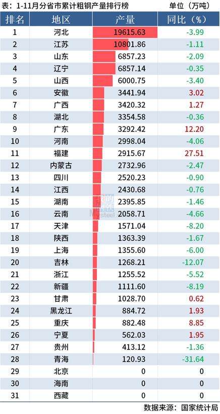 从分省数据来看,2022年前11月2个省市粗钢产量同比降幅超10%。其中吉林降12.07%、和青海降31.64%。具体情况如下: