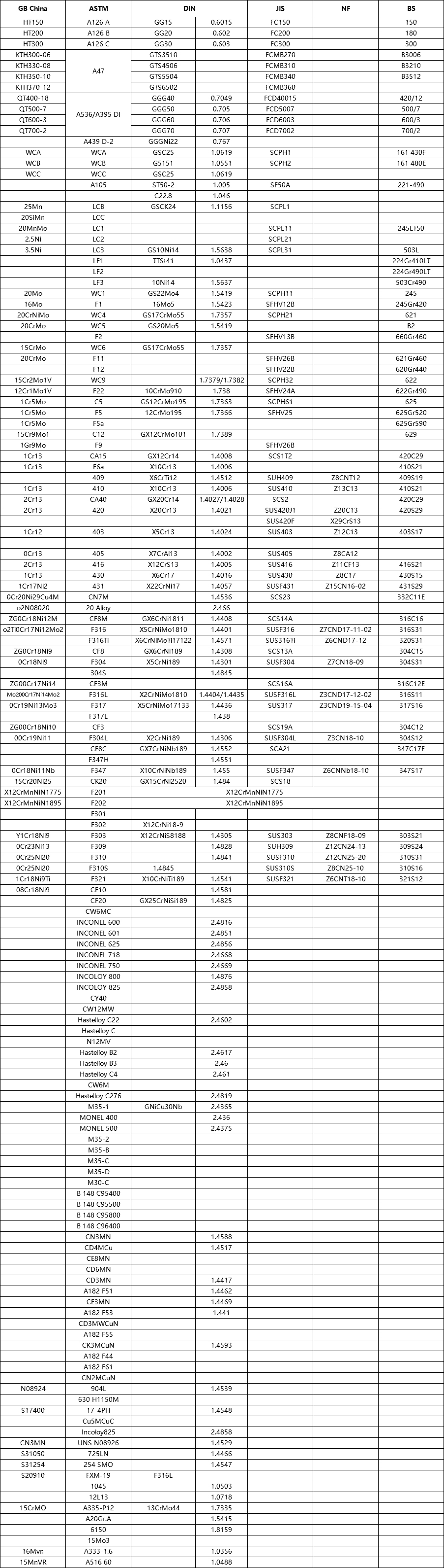 Comparison Table of Casting Material