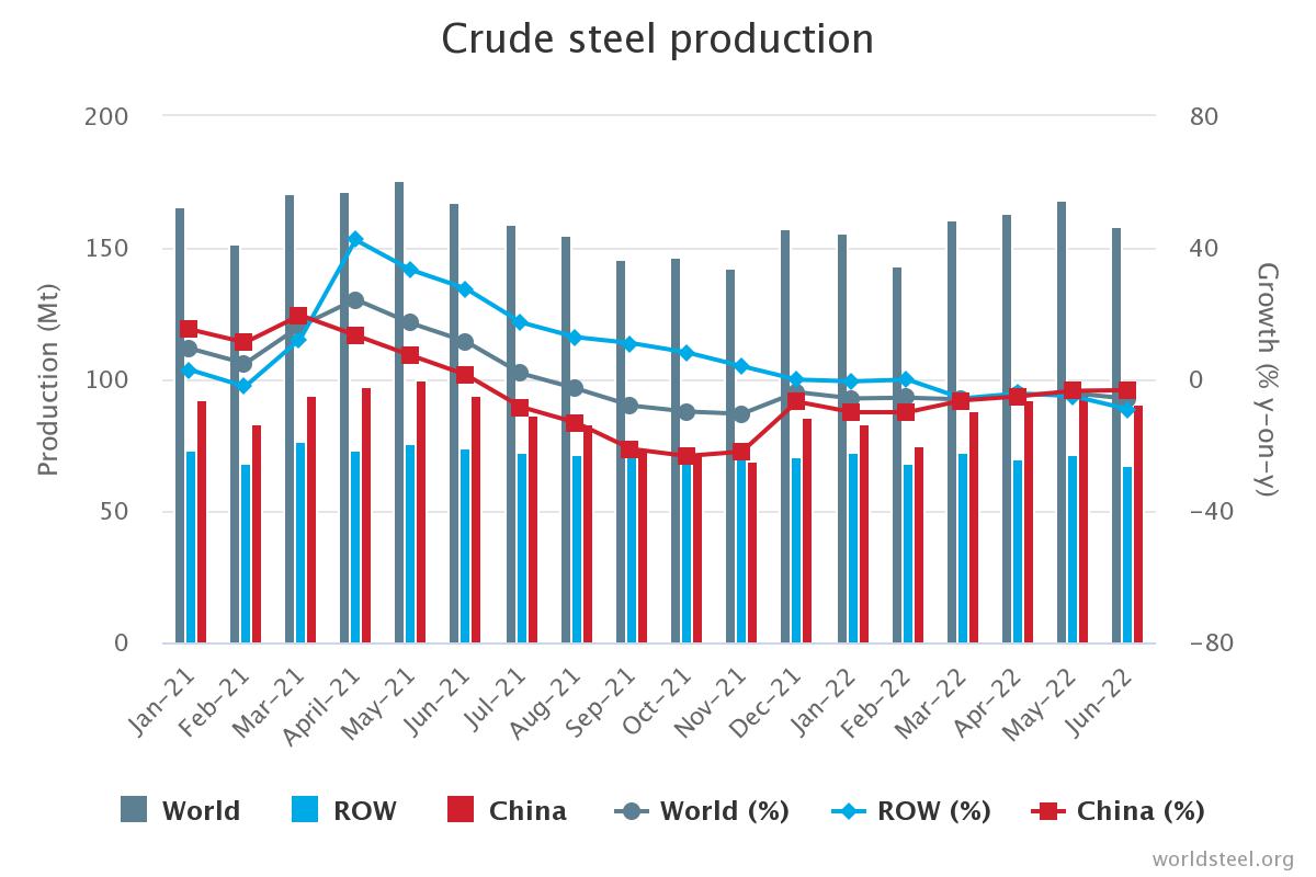 China produced 90.7 Mt in June 2022, down 3.3% on June 2021. India produced 10.0 Mt, up 6.3%. Japan produced 7.4 Mt, down 8.1%. The United States produced 6.9 Mt, down 4.2%. Russia is estimated to have produced 5.0 Mt, down 22.2%. South Korea is estimated to have produced 5.6 Mt, down 6.0%. Germany produced 3.2 Mt, down 7.0%. Turkey produced 2.9 Mt, down 13.1%. Brazil is estimated to have produced 2.9 Mt, down 6.1%. Iran is estimated to have produced 2.2 Mt, down 10.8%.