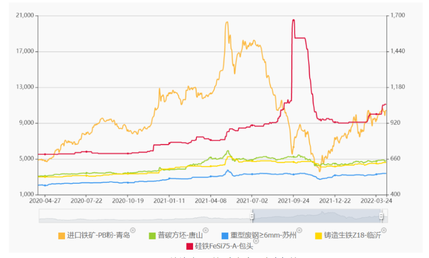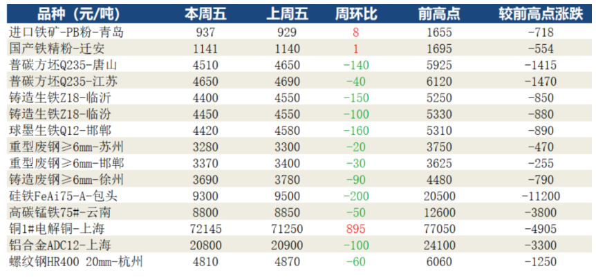 原料市场受钢材降价、钢厂利润较低,需求偏弱等原因影响,本周价格整体呈稳中下行趋势,进口矿现货价格小幅震荡,国产矿价格偏弱运行,市场成交一般。钢坯、废钢、生铁价格均受钢材大幅下跌影响紧跟下降,成交一般。铁合金价格维稳运行,成交偏弱,商家多以观望为主。铜铝市场因国内现货供应偏紧,价格保持中小幅上扬。
